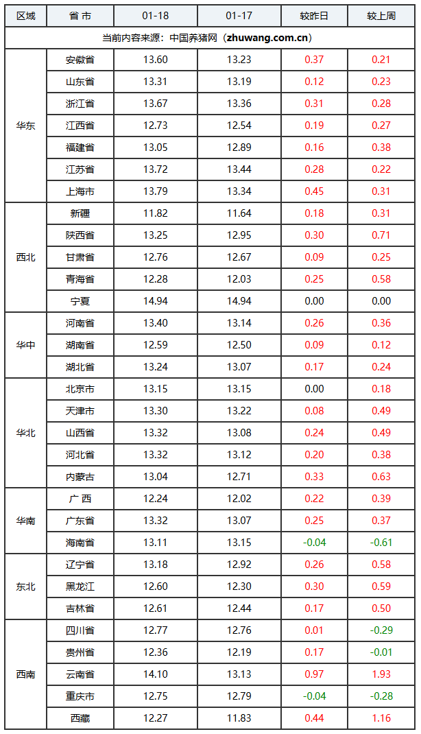 2026年01月18日-中国养猪网生猪(外三元)均价涨跌表