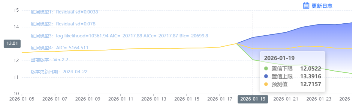 玄田算法是由项目课题组团队原创的非经典逻辑数值聚合理论和不确定性预测方法,构建了基于一致模算子的生猪价格预测模型。该模型采用的聚合函数及一致模相关理论与方法已获得多项国家自然科学基金和省级自然科学资金资助,并获得多项省级自然科学奖奖项。01月19日预测猪价为12.7157,置信区间在12.0522--13.3916之间。01月20日预测猪价为12.7020;01月21日预测猪价为12.7039。