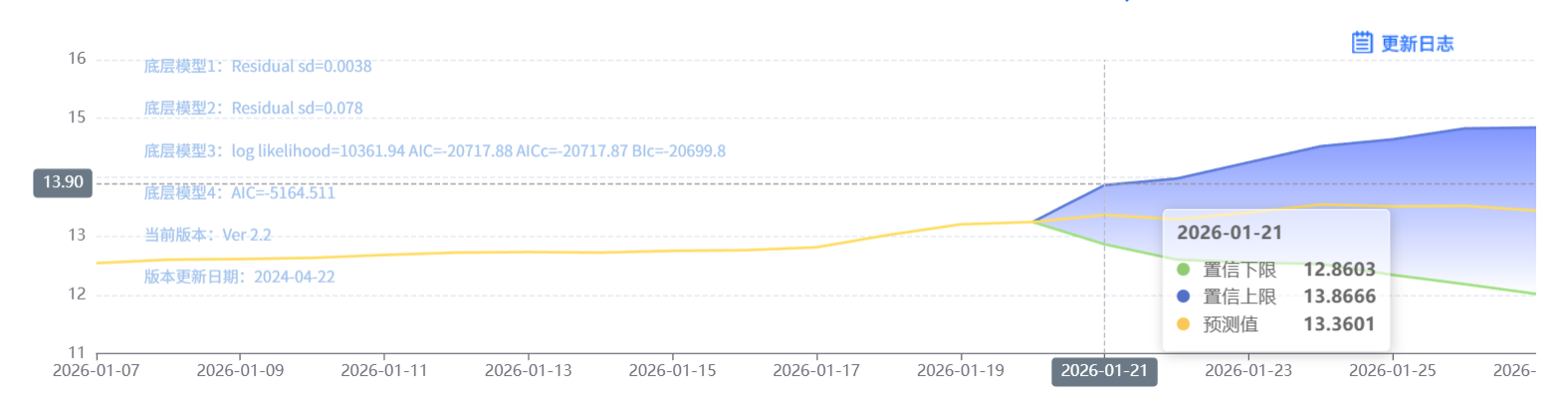 玄田算法是由项目课题组团队原创的非经典逻辑数值聚合理论和不确定性预测方法,构建了基于一致模算子的生猪价格预测模型。该模型采用的聚合函数及一致模相关理论与方法已获得多项国家自然科学基金和省级自然科学资金资助,并获得多项省级自然科学奖奖项。01月21日预测猪价为12.3601,置信区间在11.8603--13.8666之间。01月22日预测猪价为12.2856;01月23日预测猪价为12.3996。