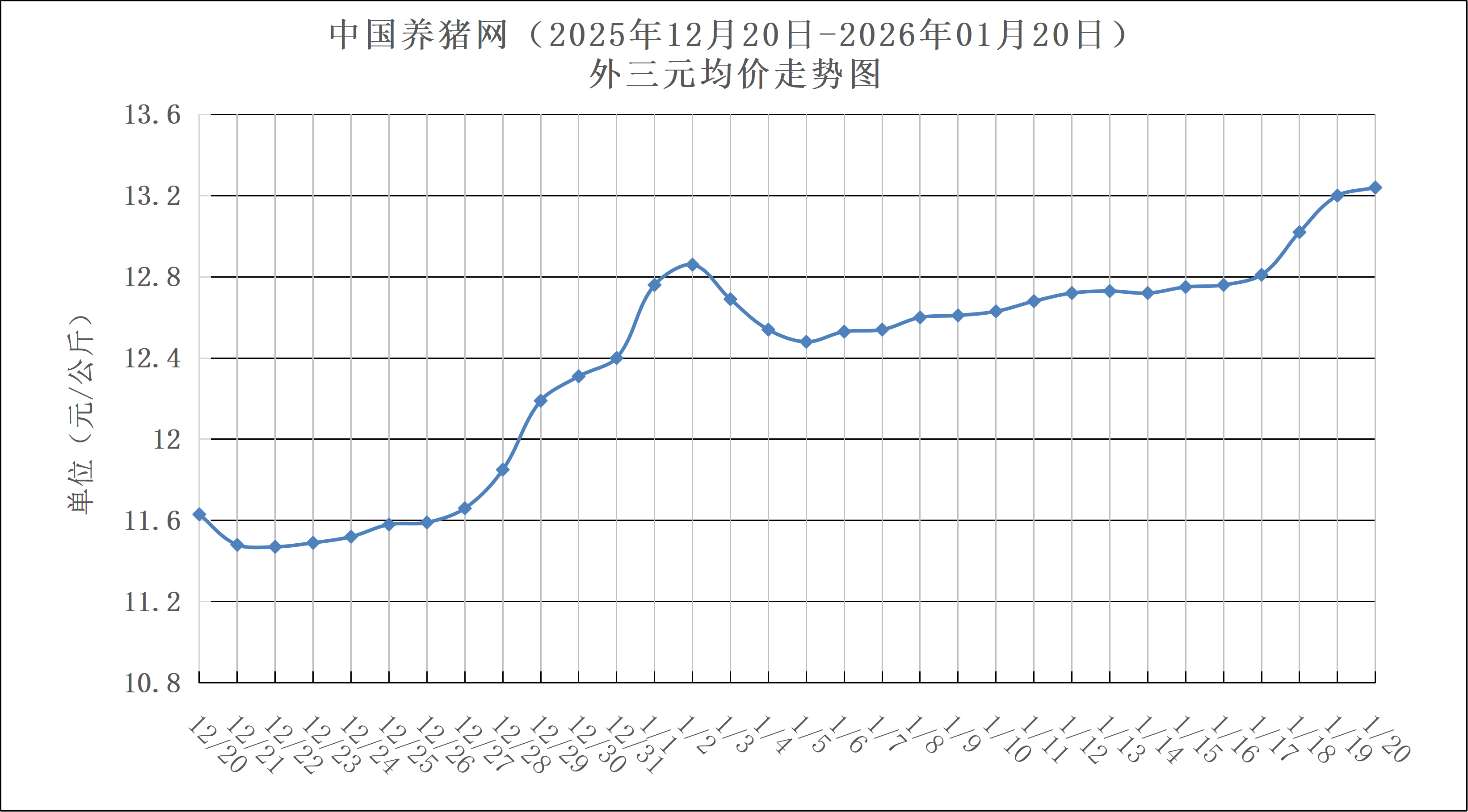 根据“2026年01月20日-中国养猪网生猪(外三元)均价涨跌表”发现,全国外三元标猪均价约为13.24元/公斤,较前一日上涨0.04元/公斤。当前生猪市场虽呈“供需双减”局面,但在养殖端缩量惜售情绪的主导下,猪价维持偏强走势。供应方面,当前规模养殖企业出栏计划环比下降,且前期集中出栏后适重生猪供应偏紧,市场存在阶段性“缺猪”压力。需求方面,元旦后腌腊支撑减弱,终端消费转淡,屠宰企业开工下滑;不过现仍处于旺季背景,北方受寒潮及节前备货带动,需求仍有韧性,支撑市场看涨预期。综合来看,短期猪价或延续震荡偏强,建议养户朋友们重点关注集团企业的实际出栏节奏变化。