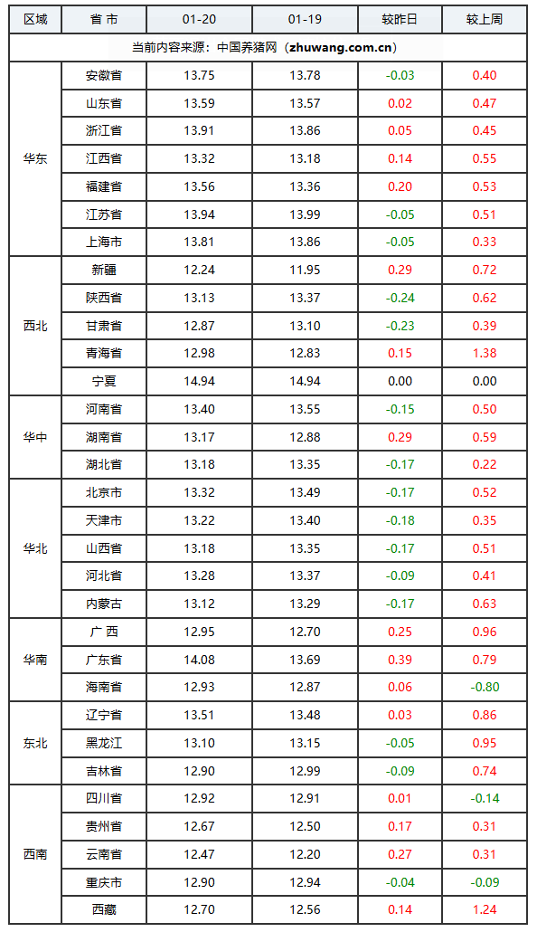 2025年01月20日(星期二),中国养猪网猪价系统数据监测如下:生猪(品种:外三元)均价为13.24元/公斤(6.62元/斤),价格较昨日上涨了0.04元/公斤(0.02元/斤);猪价环比上涨13.84%,同比下跌14.80%。