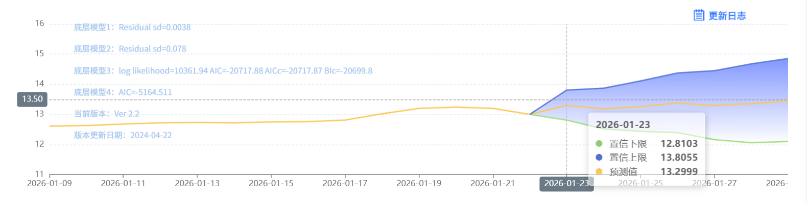 玄田算法是由项目课题组团队原创的非经典逻辑数值聚合理论和不确定性预测方法,构建了基于一致模算子的生猪价格预测模型。该模型采用的聚合函数及一致模相关理论与方法已获得多项国家自然科学基金和省级自然科学资金资助,并获得多项省级自然科学奖奖项。01月23日预测猪价为13.2999,置信区间在12.8103--13.8055之间。01月24日预测猪价为13.1845;01月25日预测猪价为13.2622。