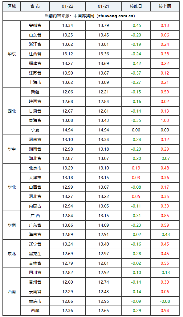 2026年01月21日-中国养猪网生猪(外三元)均价涨跌表
