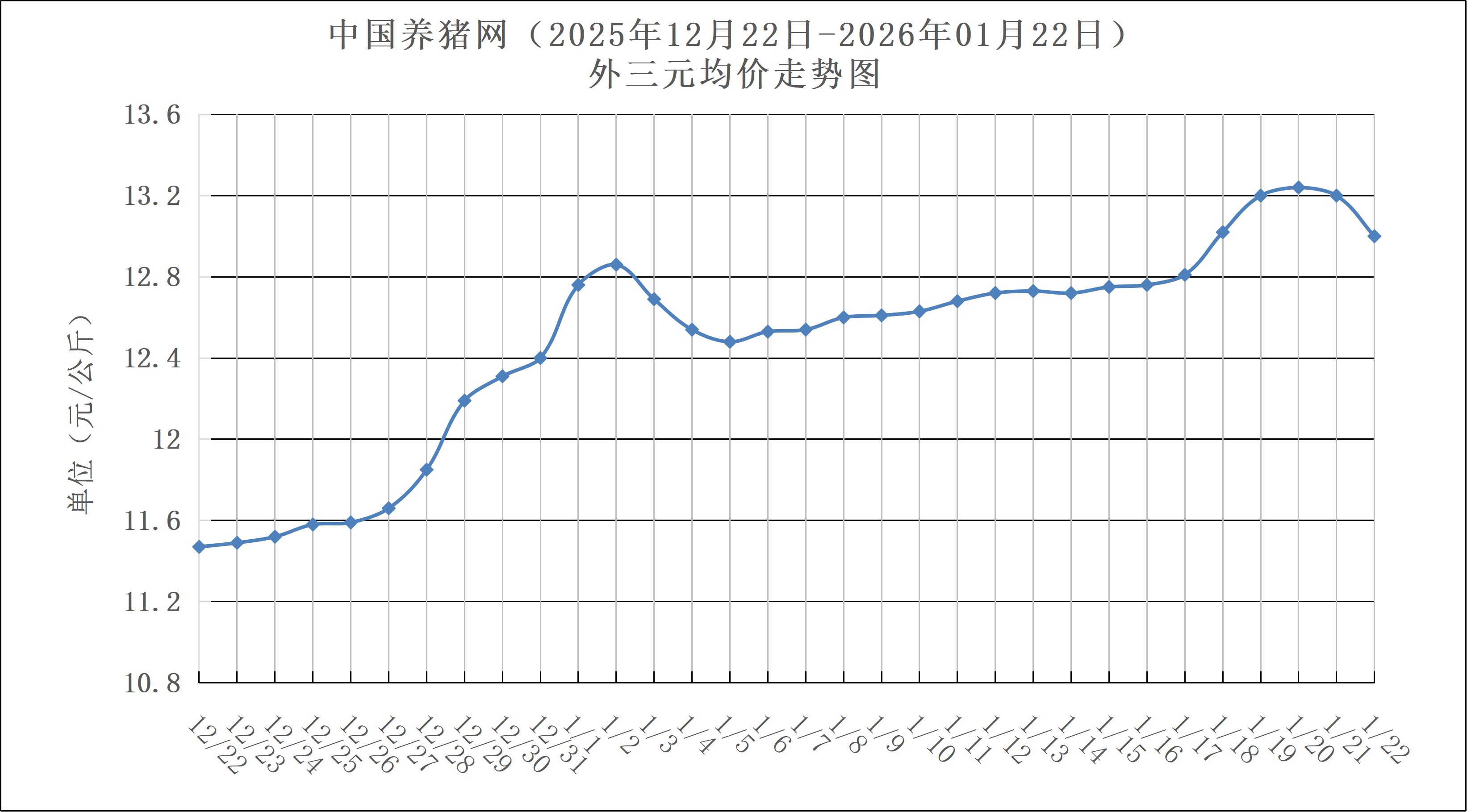根据“2026年01月22日-中国养猪网生猪(外三元)均价涨跌表”发现,全国外三元标猪均价约为13元/公斤,较前一日下跌0.20元/公斤。供应方面,随着月末临近,市场对于节后行情的普遍看淡,部分养殖企业将2月计划提前出栏,导致近期供应集中增加,呈现“抢跑”态势。需求方面,元旦后消费持续疲软,南方腌腊需求消退,北方节前备货尚未启动,屠宰企业订单减少,样本企业开工率下降,市场支撑明显不足。综合来看,在供应放量、消费跟进的背景下,猪价短期仍将承压运行。