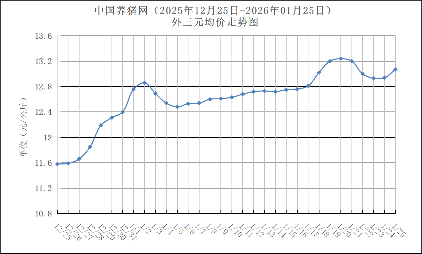 2025年12月25日-2026年01月25日中国养猪网生猪(外三元)均价走势图
