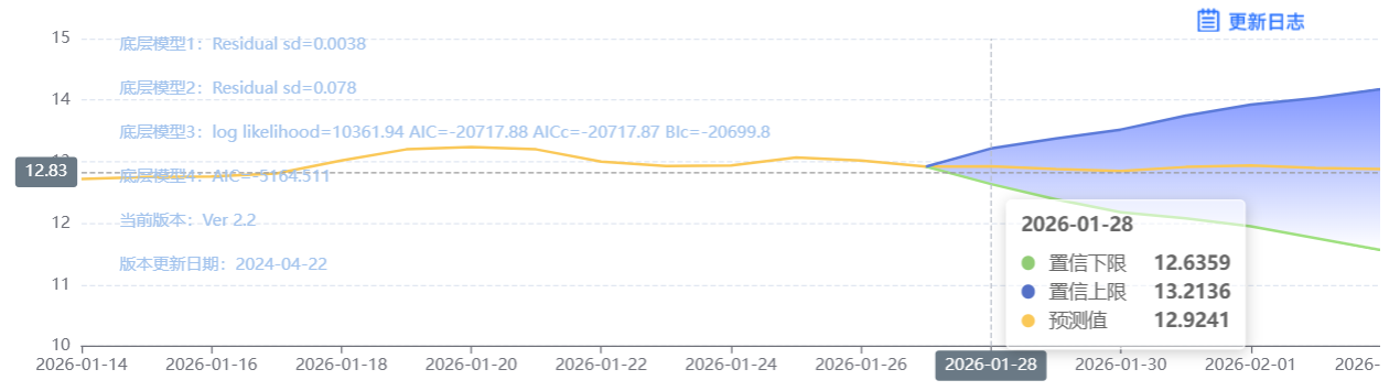 玄田算法是由项目课题组团队原创的非经典逻辑数值聚合理论和不确定性预测方法,构建了基于一致模算子的生猪价格预测模型。该模型采用的聚合函数及一致模相关理论与方法已获得多项国家自然科学基金和省级自然科学资金资助,并获得多项省级自然科学奖奖项。01月28日预测猪价为13.0262,置信区间在12.5357--13.527之间。01月29日预测猪价为13.0091;01月30日预测猪价为13.1350。