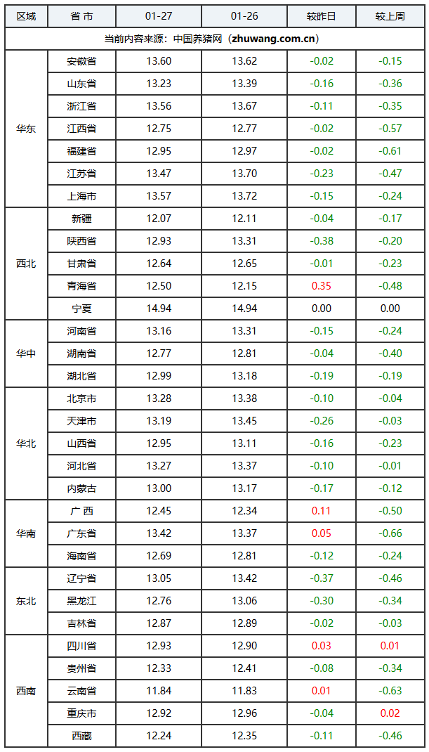 2026年01月27日-中国养猪网生猪(外三元)均价涨跌表