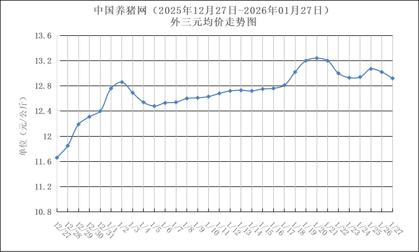 2025年12月27日-2026年01月27日中国养猪网生猪(外三元)均价走势图