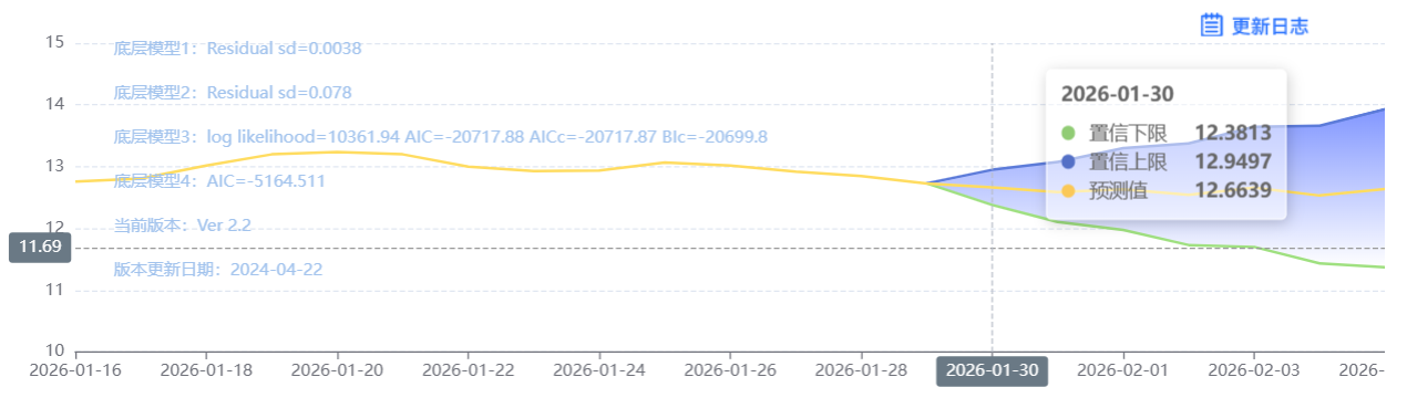 玄田算法是由项目课题组团队原创的非经典逻辑数值聚合理论和不确定性预测方法,构建了基于一致模算子的生猪价格预测模型。该模型采用的聚合函数及一致模相关理论与方法已获得多项国家自然科学基金和省级自然科学资金资助,并获得多项省级自然科学奖奖项。01月30日预测猪价为12.8278,置信区间在12.3405--13.3267之间。01月31日预测猪价为12.8482;02月01日预测猪价为12.7949。