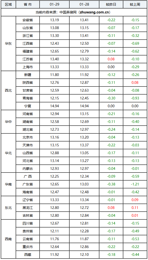 2026年01月29日-中国养猪网生猪(外三元)均价涨跌表