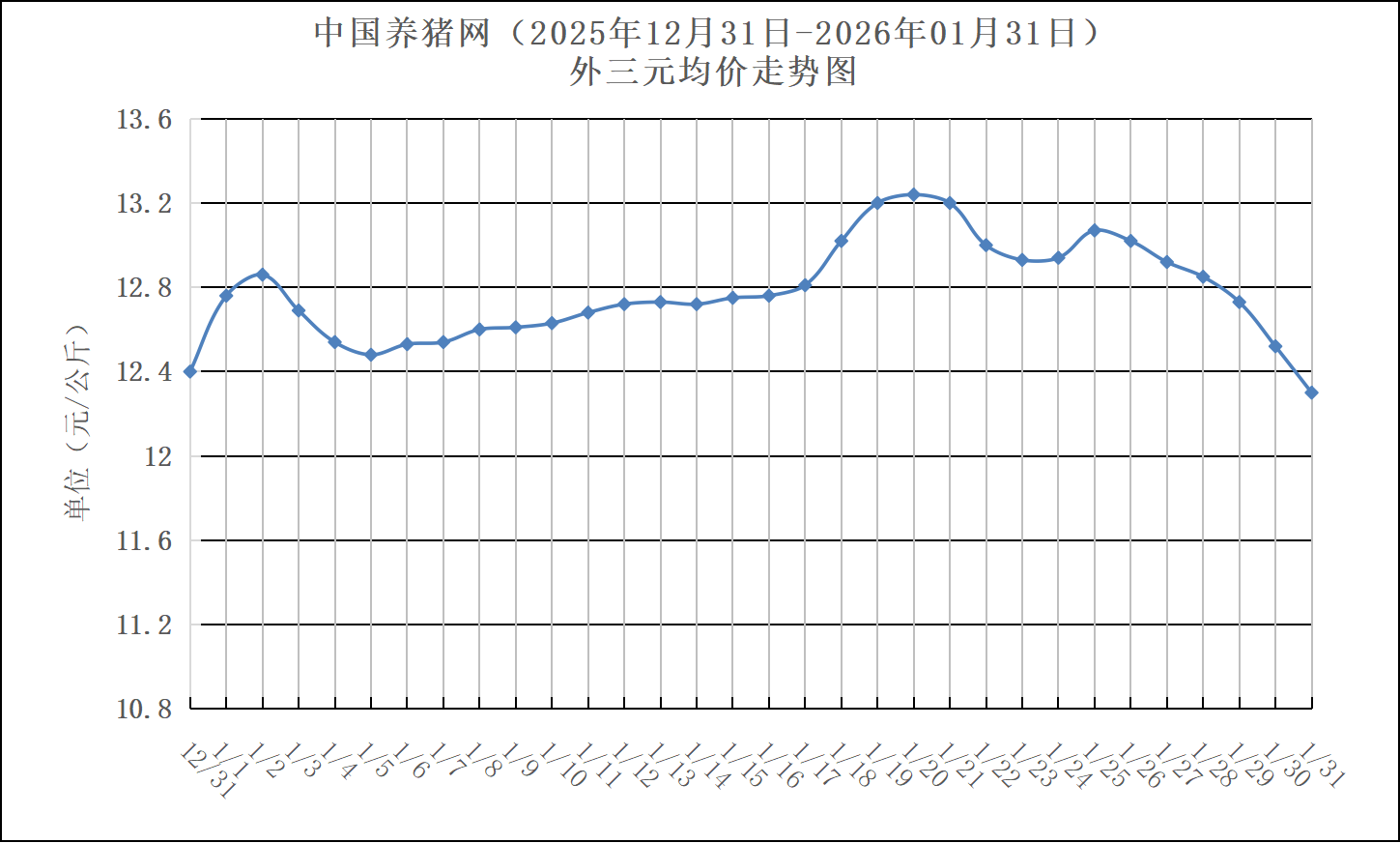 2025年12月31日-2026年01月31日中国养猪网生猪(外三元)均价走势图