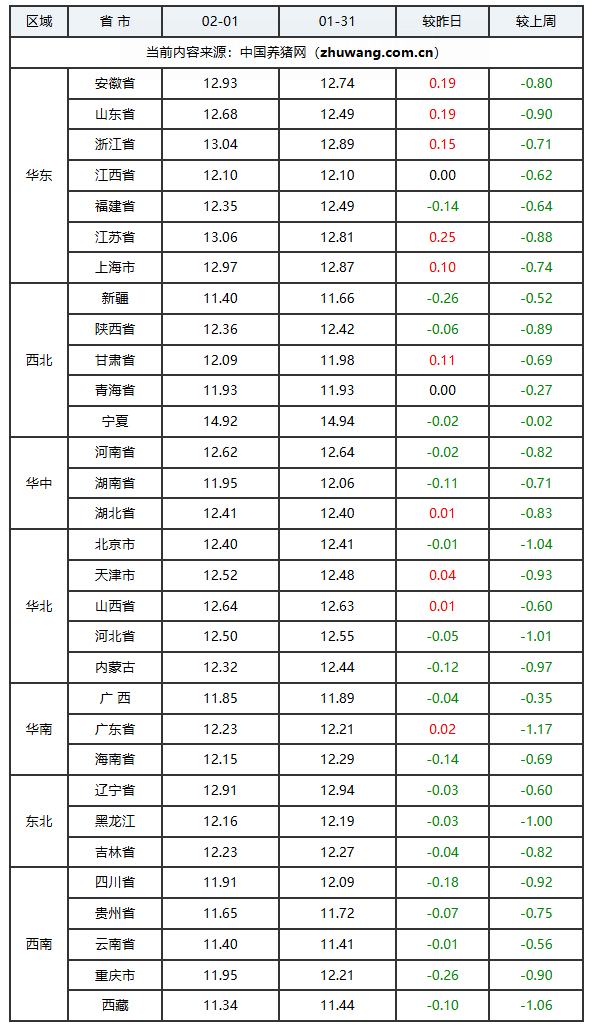 根据“2026年02月01日-中国养猪网生猪(外三元)均价涨跌表”发现,全国各省份生猪价格多数位于每公斤11-13元区间。与昨日相比,价格呈现区域分化:华东地区普遍上涨;西南、西北部分省份则下跌明显。临近春节,生猪市场供需失衡加剧,价格持续承压。当前标猪均价已跌至12.29元/公斤的月内低点。供应端因出栏窗口收窄及对后市担忧,养殖户出栏意愿增强,特别是南方猪源北调加剧了供应压力;而需求端受消费习惯变化及囤货意愿低迷影响,屠宰企业开工率下降,承接乏力。叠加出栏均重上升、养殖利润微薄等因素,市场呈现明显的供强需弱格局,节前猪价预计维持弱势。