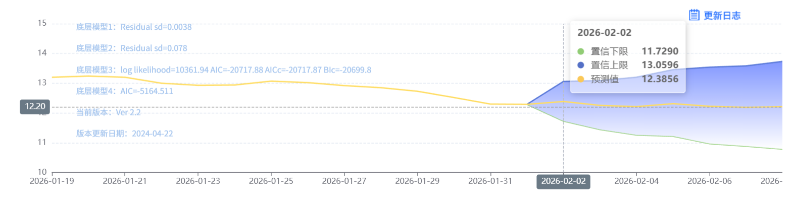 玄田算法是由项目课题组团队原创的非经典逻辑数值聚合理论和不确定性预测方法,构建了基于一致模算子的生猪价格预测模型。该模型采用的聚合函数及一致模相关理论与方法已获得多项国家自然科学基金和省级自然科学资金资助,并获得多项省级自然科学奖奖项。02月02日预测猪价为12.3856,置信区间在11.7290--13.0596之间。02月03日预测猪价为12.2545;02月04日预测猪价为12.2141。