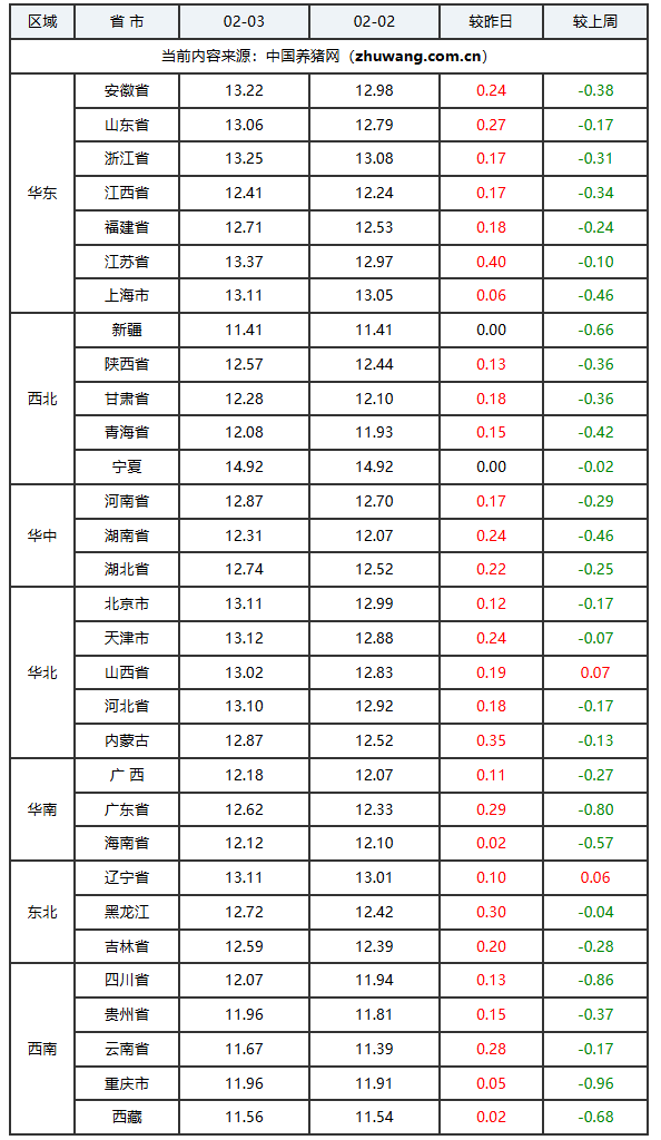 根据“2026年02月03日-中国养猪网生猪(外三元)均价涨跌表”发现,近两日全国生猪价格普遍上扬,市场看涨情绪增强。推动价格上涨的因素主要有两方面:供应端方面,由于前期猪价偏低,养殖户惜售情绪增强,社会场及规模企业抬价出栏现象增多,市场对低价出猪较为抵触,导致多地屠宰企业收购节奏放缓,部分区域猪源供应呈现偏紧态势。需求端方面,随着腊月进程过半,春节氛围渐浓,家庭消费及农村市场猪肉采购增加,商超促销活动带动鲜肉销售回暖,屠宰企业开工率逐步提升。尤其临近小年,为保障节日供应,屠宰企业预计将加大备货力度,开工水平有望继续上升,对猪肉的承接能力也将进一步增强。综合来看,在节前备货预期加强、养殖端挺价意愿明显的共同影响下,国内猪价整体上移。