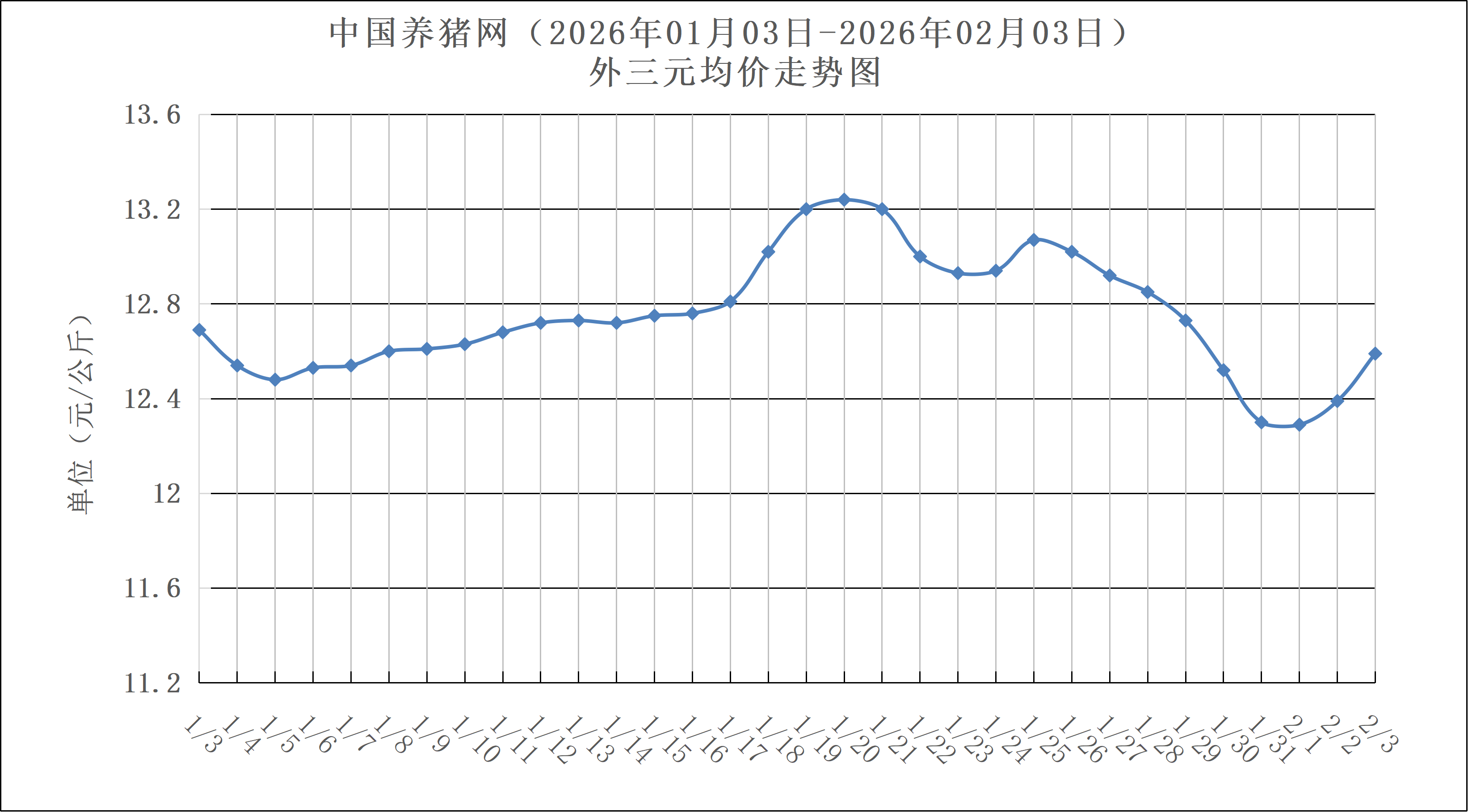 2025年02月03日(星期二),中国养猪网猪价系统数据监测如下:生猪(品种:外三元)均价为12.59元/公斤(6.295元/斤),价格较昨日上涨了0.20元/公斤(0.10元/斤);猪价环比下跌0.79%,同比下跌23.42%。