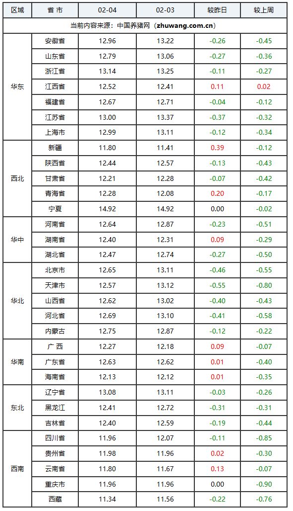 2026年02月04日-中国养猪网生猪(外三元)均价涨跌表