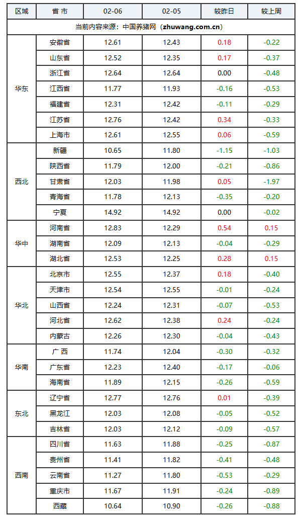 据“2026年02月06日-中国养猪网生猪(外三元)均价涨跌表”发现,国内外三元生猪价格延续震荡下行的态势。猪价走势为10涨2平19跌。目前国内生猪市场多空情绪交织,需求端受外来务工人员返乡及学校放假等因素影响,消费集中度减弱,虽然家庭采购有所增加,但整体支撑有限,屠宰企业开工率处于低位。供应方面,春节前出栏时间窗口收窄,养殖端出栏意愿上升,叠加前期压栏及二次育肥猪源陆续释放,市场供给压力较为明显。综合来看,在消费跟进乏力而供应持续宽松的格局下,市场心态普遍承压,看跌情绪逐渐占据上风,带动猪价整体进入下行通道,近期呈现连续偏弱调整的走势。