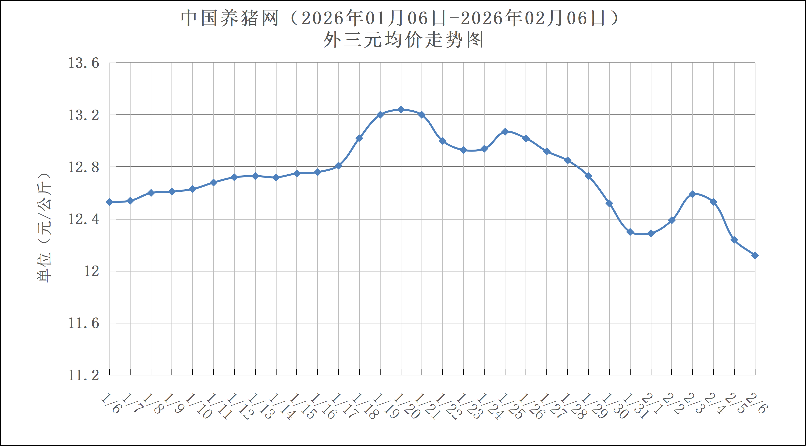 2025年02月06日(星期五),中国养猪网猪价系统数据监测如下:生猪(品种:外三元)均价为12.12元/公斤(6.06元/斤),价格较昨日下跌了0.12元/公斤(0.06元/斤);猪价环比下跌3.27%,同比下跌24.63%。