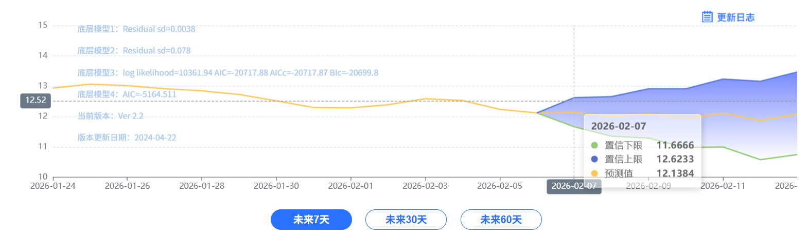 玄田算法是由项目课题组团队原创的非经典逻辑数值聚合理论和不确定性预测方法,构建了基于一致模算子的生猪价格预测模型。该模型采用的聚合函数及一致模相关理论与方法已获得多项国家自然科学基金和省级自然科学资金资助,并获得多项省级自然科学奖奖项。02月07日预测猪价为12.1384,置信区间在11.6666--12.6233之间。02月08日预测猪价为12.0028;02月09日预测猪价为12.0980。