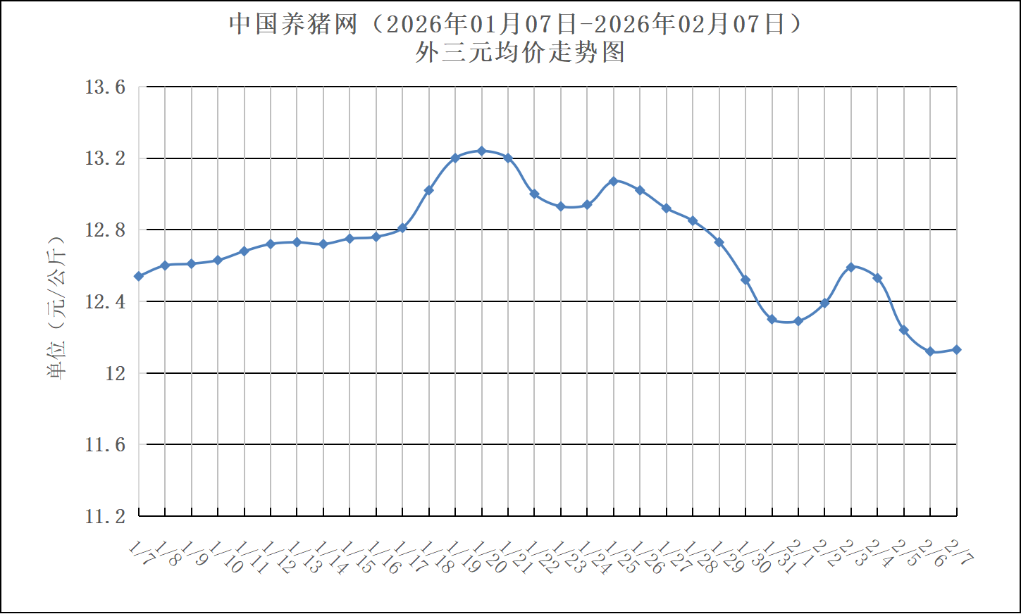 2026年01月07日-2026年02月07日中国养猪网生猪(外三元)均价走势图