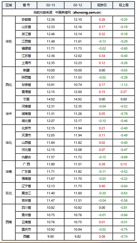 2026年02月13日-中国养猪网生猪(外三元)均价涨跌表