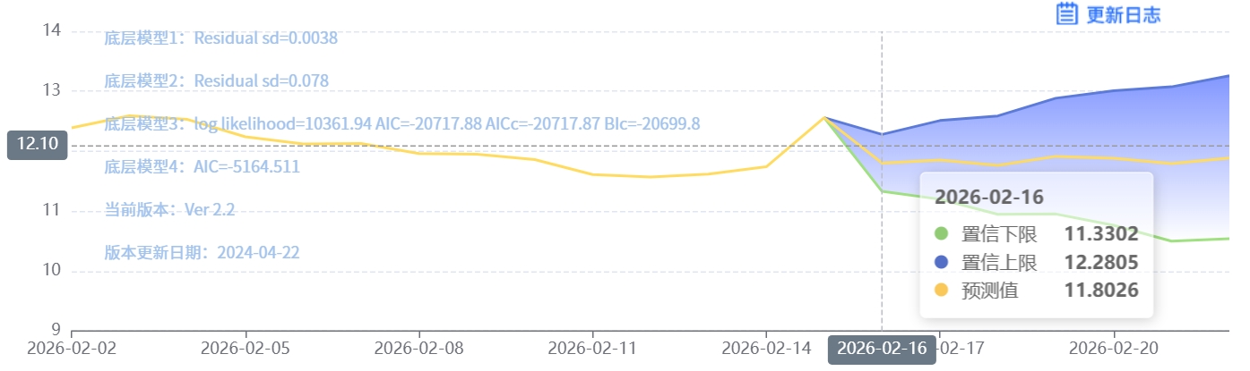 玄田算法是由项目课题组团队原创的非经典逻辑数值聚合理论和不确定性预测方法,构建了基于一致模算子的生猪价格预测模型。该模型采用的聚合函数及一致模相关理论与方法已获得多项国家自然科学基金和省级自然科学资金资助,并获得多项省级自然科学奖奖项。02月16日预测猪价为11.8026,置信区间在11.3302--12.2805之间。02月17日预测猪价为11.8525;02月18日预测猪价为11.7630。