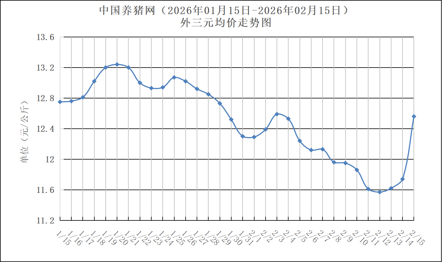 2026年01月15日-2026年02月15日中国养猪网生猪(外三元)均价走势图