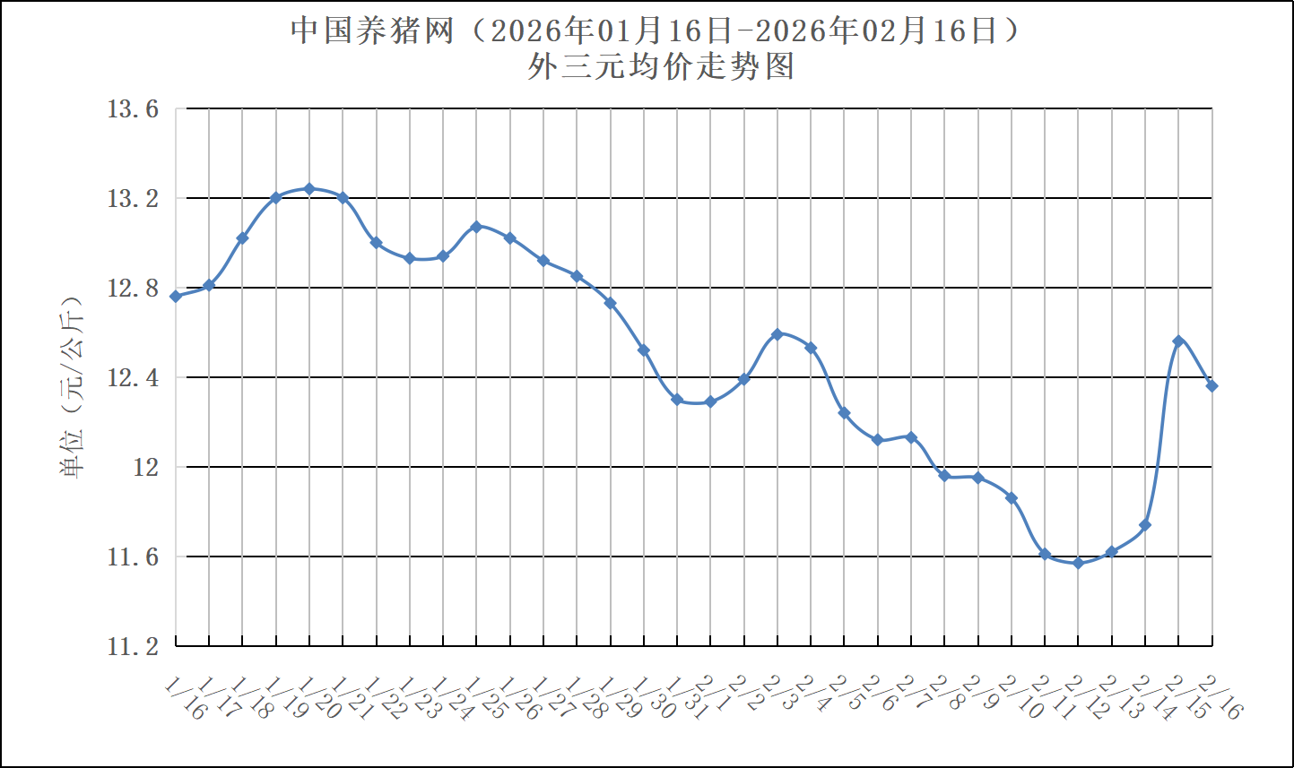2026年01月16日-2026年02月16日中国养猪网生猪(外三元)均价走势图