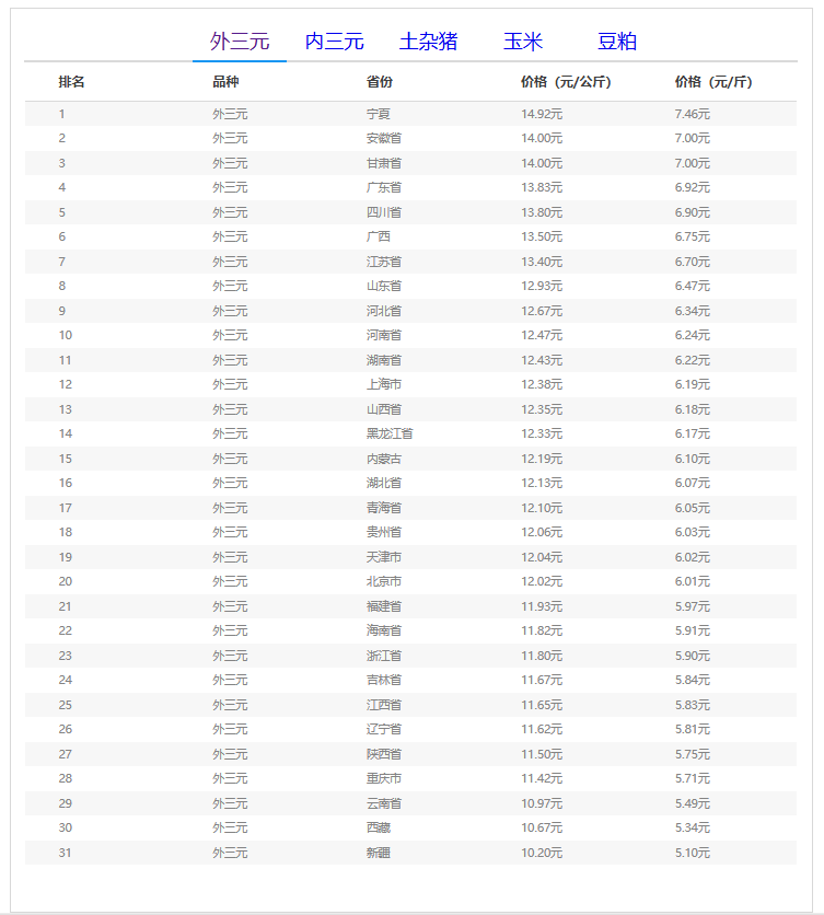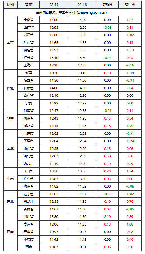 2025年02月17日(星期二),中国养猪网猪价系统数据监测如下:生猪(品种:外三元)均价为12.52元/公斤(6.26元/斤),价格较昨日上涨了0.16元/公斤(0.08元/斤);猪价环比下跌2.26%,同比下跌14.48%。