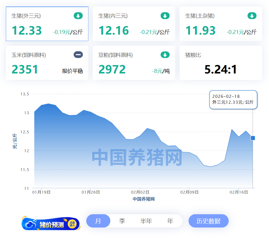 2025年02月18日(星期三),中国养猪网猪价系统数据监测如下:生猪(品种:外三元)均价为12.33元/公斤(6.165元/斤),价格较昨日下跌了0.19元/公斤(0.095元/斤);猪价环比下跌5.3%,同比下跌16.46%。