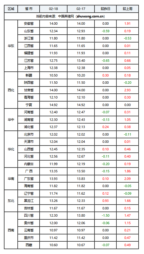 据“2026年02月18日-中国养猪网生猪(外三元)均价涨跌表”发现,全国猪价迎来明显回调,前期连续上涨的行情戛然而止,多地价格小幅下跌。随着春节集中备货阶段结束,终端消费逐步降温,屠企收猪意愿减弱,压价情绪有所显现,市场供需格局开始转向宽松。从区域来看,北方地区率先走弱,成为本轮下跌的主要区域,华东、华中部分高价区也随之松动,华南、西南地区虽局部暂稳,但上涨动力明显不足。整体来看,猪价冲高回落态势明确,节后消费淡季来临,短期内猪价或将延续震荡偏弱运行,养殖户可根据自身情况合理安排出栏节奏,谨慎观望。