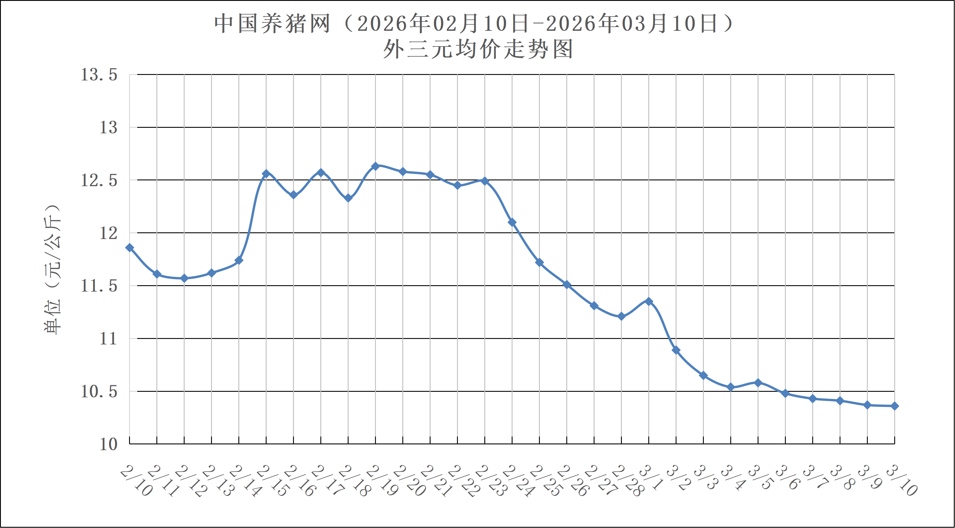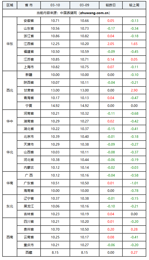 根据中国养猪网2026年3月10日的外三元生猪报价,今日全国猪价延续小幅下降走势。3月生猪供给压力较大,前期部分上市计划推迟,叠加当月大型养殖企业计划投放量环比增长,加之肥猪需求疲软、标肥价差倒挂,养殖户出栏意愿强烈,市场流通货源充足。需求方面,正值季节性消费低谷,缺乏利好刺激,尽管饮食业店内就餐有所恢复,但本地需求不足,居民膳食偏清淡,鲜肉走货缓慢,屠企开工率持续偏低,难以对价格形成支撑。当前供需两弱,猪价面临下行压力。不过,低价可能激发养殖户扛价、二次育肥及屠企逢低入库,同时市场对第三季度行情预期向好,或催生低位买入情绪,猪价有望逐步触底。