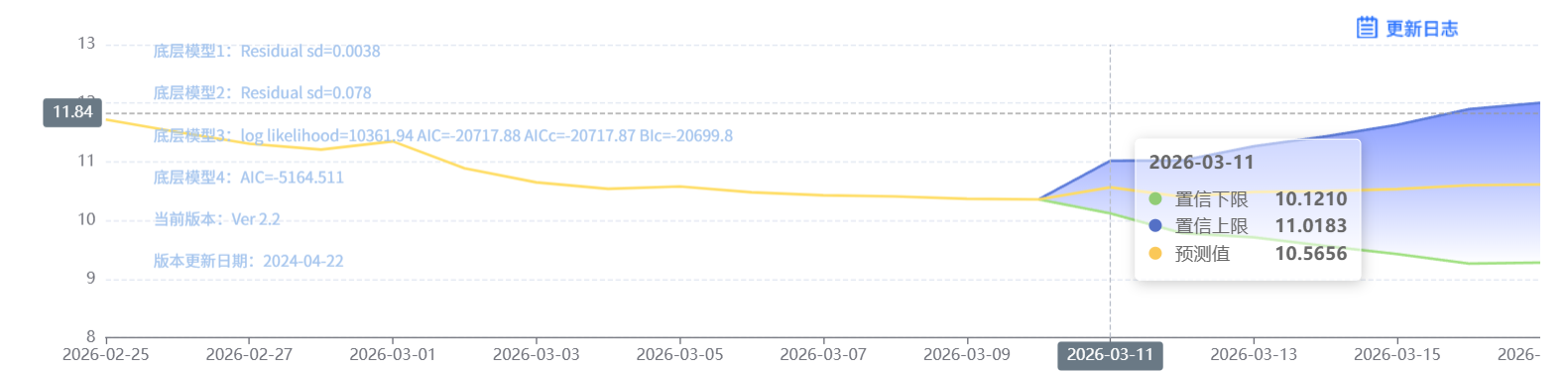 玄田算法是由项目课题组团队原创的非经典逻辑数值聚合理论和不确定性预测方法,构建了基于一致模算子的生猪价格预测模型。该模型采用的聚合函数及一致模相关理论与方法已获得多项国家自然科学基金和省级自然科学资金资助,并获得多项省级自然科学奖奖项。03月11日预测猪价为10.5656,置信区间在10.1210--11.0183之间。03月12日预测猪价为10.4049;03月13日预测猪价为10.4864。