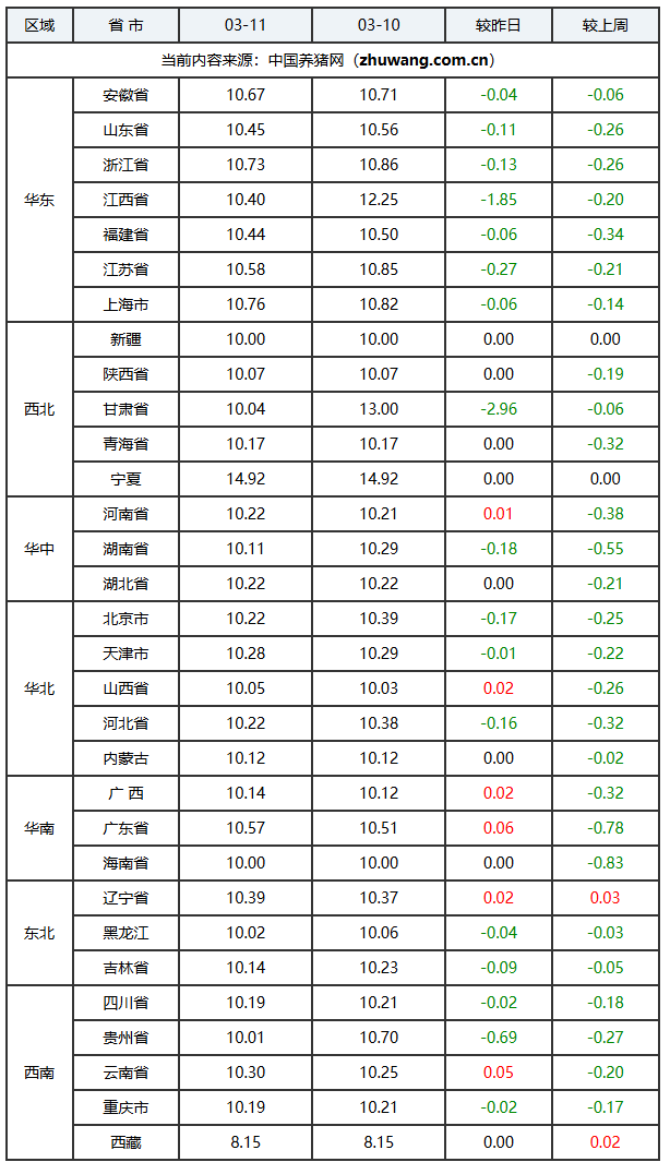 2026年03月11日-中国养猪网生猪(外三元)均价涨跌表
