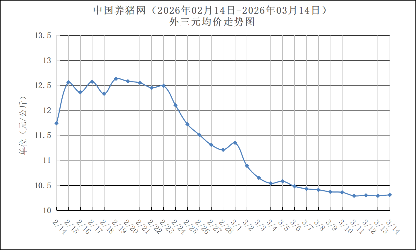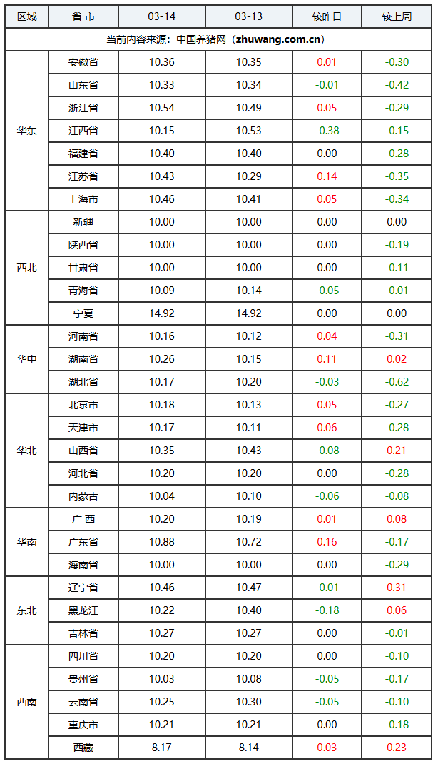 2026年03月14日-中国养猪网生猪(外三元)均价涨跌表