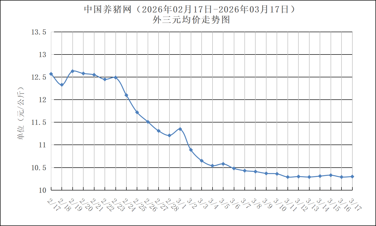2026年02月17日-2026年03月17日中国养猪网生猪(外三元)均价走势图