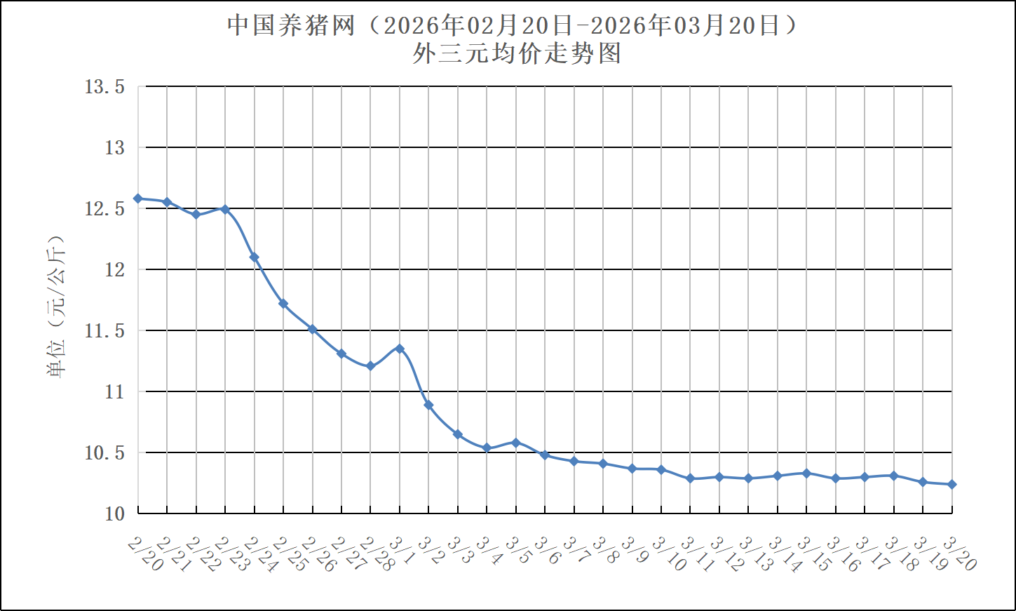 根据中国养猪网2026年3月20日的外三元生猪报价,今日全国猪价延续弱势下跌态势。根据中国养猪网数据,3月20日全国外三元生猪均价为10.24元/公斤,较昨日下跌0.02元/公斤,继续在10元/公斤关口上方震荡。当前猪价下跌主要受“供强需弱”格局影响。供应端,生猪出栏量仍处高位,规模企业出栏计划完成率仅为65%,下旬仍有出栏压力;需求端,春节后进入传统消费淡季,终端消费疲软,白条猪肉走货缓慢。行业已陷入深度亏损,自繁自养模式下头均亏损接近190元,外购仔猪养殖头均亏损超过310元。政策层面开始释放“托底”信号,农业农村部联合发改委提出将能繁母猪存栏量调控目标下调至3650万头左右,并要求企业调减年度出栏量。但短期效果有限,市场预计猪价将在10.0-10.5元/公斤区间底部震荡,下半年随着产能去化加速,供需格局有望逐步改善。
