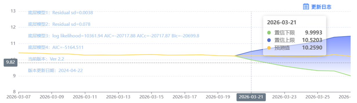 玄田算法是由项目课题组团队原创的非经典逻辑数值聚合理论和不确定性预测方法,构建了基于一致模算子的生猪价格预测模型。该模型采用的聚合函数及一致模相关理论与方法已获得多项国家自然科学基金和省级自然科学资金资助,并获得多项省级自然科学奖奖项。03月21日预测猪价为10.2590,置信区间在9.9993-10.5203之间。03月22日预测猪价为10.2479;03月23日预测猪价为10.2065。