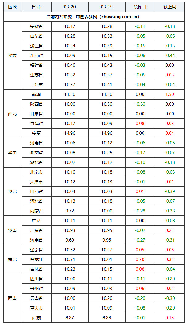 2026年03月20日-中国养猪网生猪(外三元)均价涨跌表