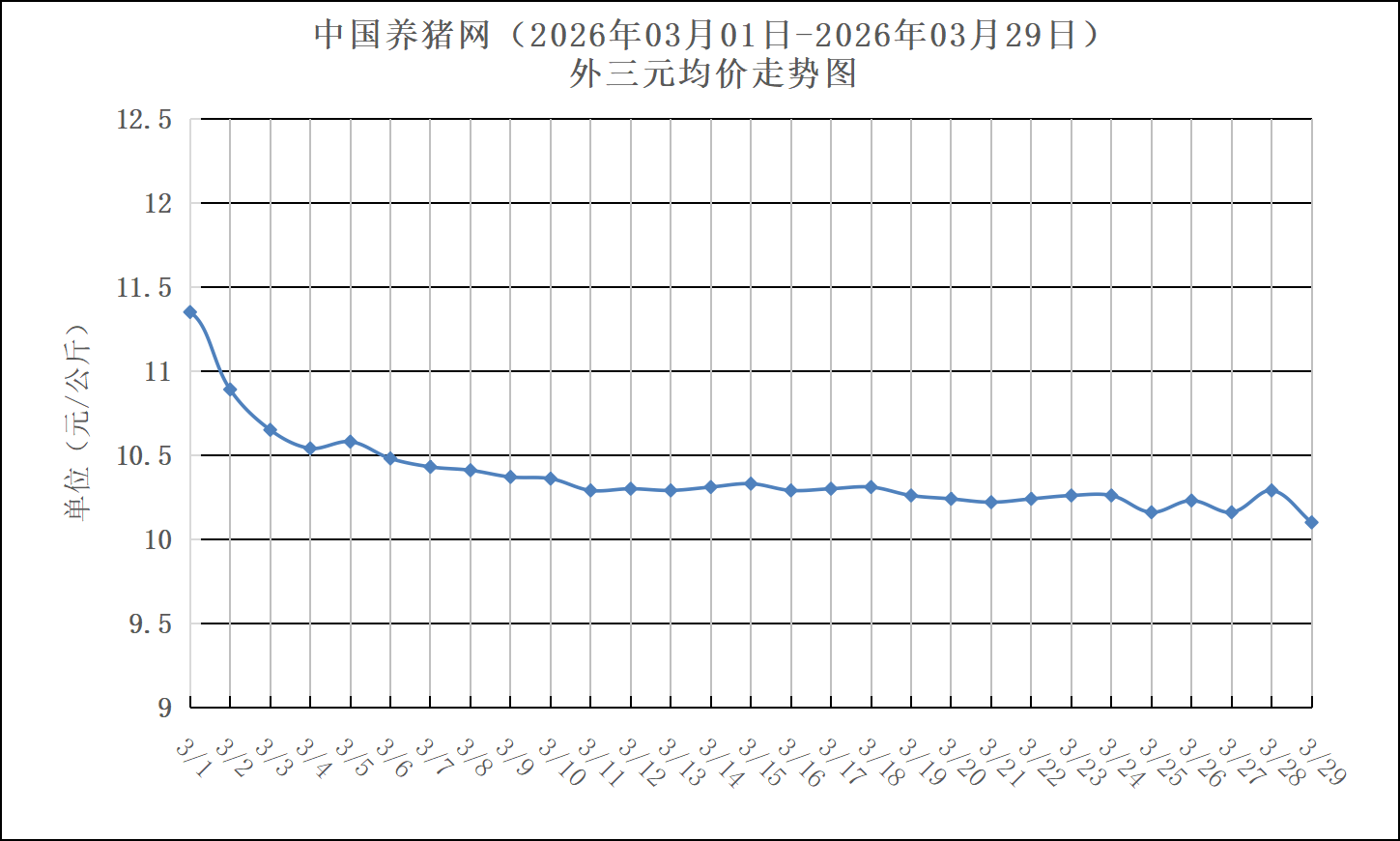 2025年03月29日(星期日),中国养猪网猪价系统数据监测如下:生猪(品种:外三元)均价为10.10元/公斤(5.05元/斤),价格较昨天下跌了0.19元/公斤(0.10元/斤);猪价环比下跌11.01%,同比下跌30.77%。