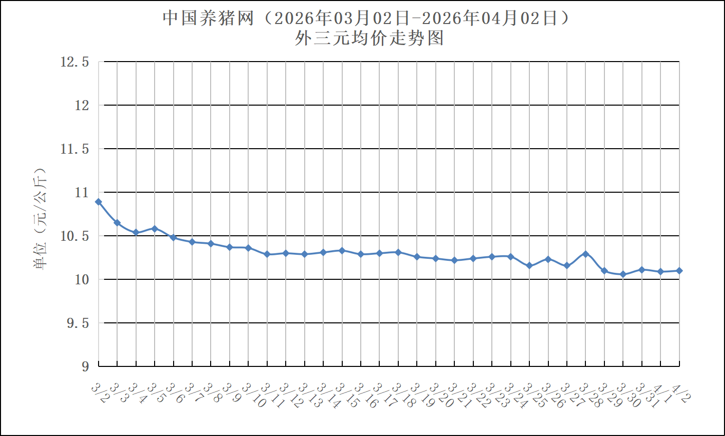 2025年04月02日(星期四),中国养猪网猪价系统数据监测如下:生猪(品种:外三元)均价为10.10元/公斤(5.05元/斤),价格较昨天上涨了0.01元/公斤(0.01元/斤);猪价环比下跌7.25%,同比下跌31.29%。