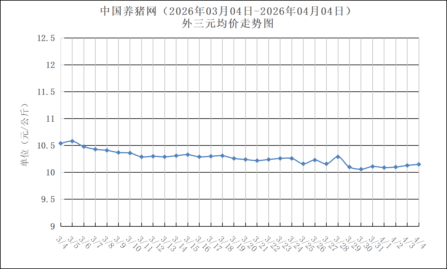 2026年03月04日-2026年04月04日中国养猪网生猪(外三元)均价走势图