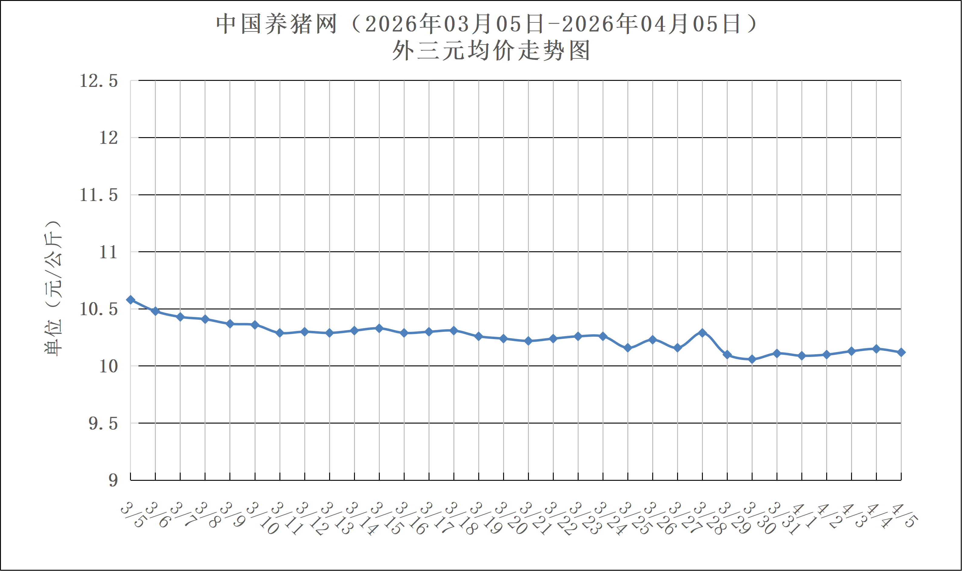 、2026年03月05日-2026年04月05日中国养猪网生猪(外三元)均价走势图