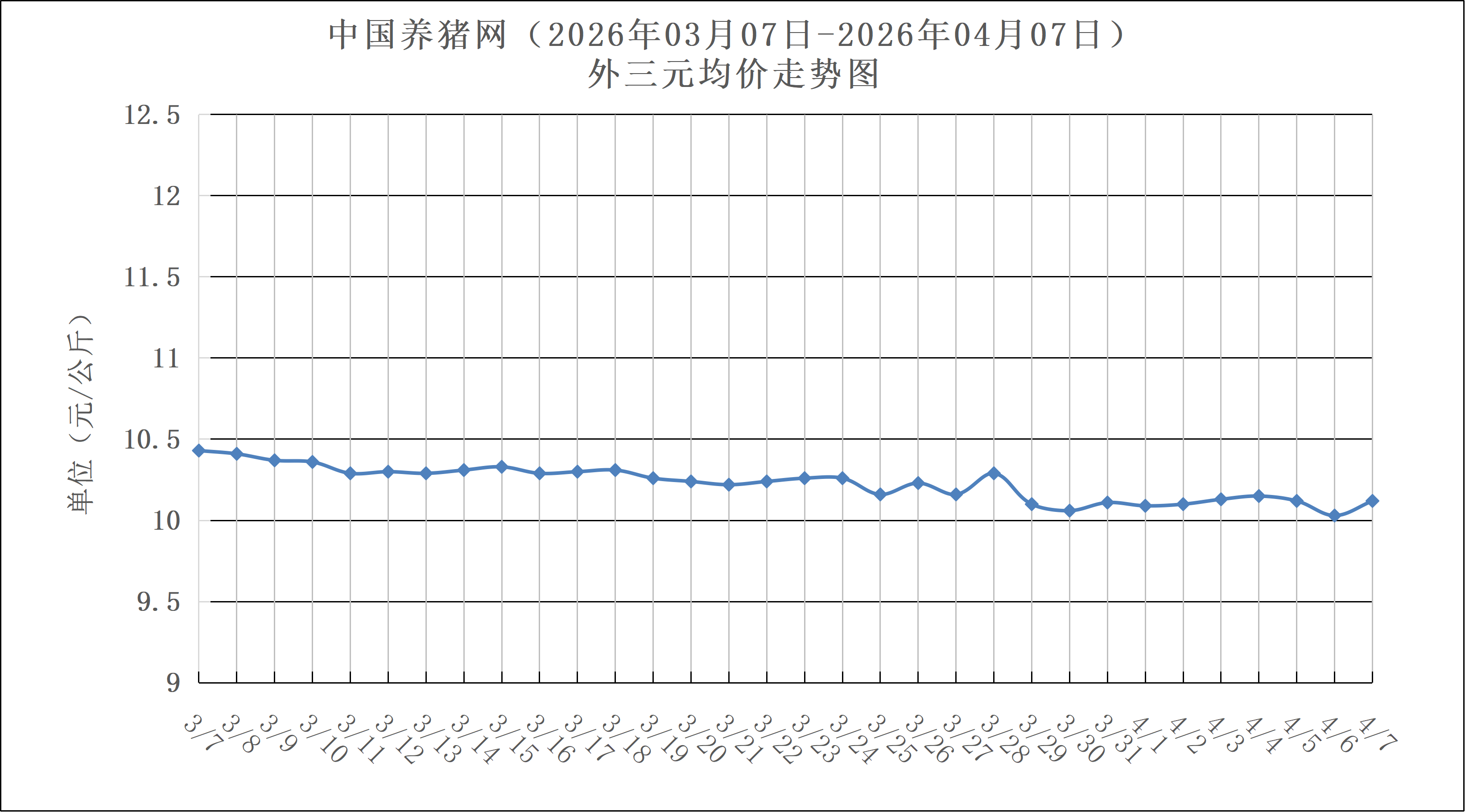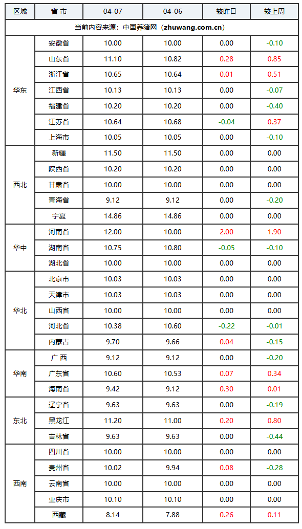 2025年04月07日(星期二),中国养猪网猪价系统数据监测如下:生猪(品种:外三元)均价为10.12元/公斤(5.06元/斤),价格较昨天上涨了0.09元/公斤(0.045元/斤);猪价环比下跌2.97%,同比下跌1.3%。