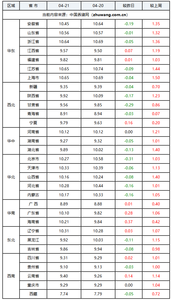 据“2026年04月21日-中国养猪网生猪(外三元)均价涨跌表”发现,猪价冲不动,上涨乏力。一方面规模猪企本月出栏计划环比增加,短暂缩量后认卖积极性提升,北方多地屠宰场收猪难度减弱,生猪供应能力明显增强。另一方面,标肥价差基本消失,随着气温升高,肥猪需求进入淡季,中大猪跟涨乏力,压栏增重性价比下降。二次育肥对5-6月猪价前景信心不足,补栏谨慎。此外,屠宰场前期频繁分割入库已使冻品库容较高,进一步入库意愿降低;鲜品猪肉购销仍处淡季,需求支撑乏力。多重因素叠加,猪价进一步冲高阻力加大,存在转弱回调压力。