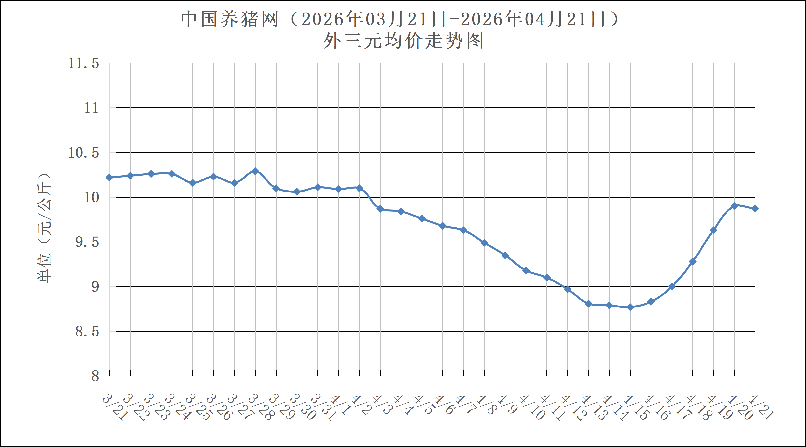 2025年04月21日(星期二),中国养猪网猪价系统数据监测如下:生猪(品种:外三元)均价为9.87元/公斤(4.935元/斤),价格较昨天下跌了0.03元/公斤(0.015元/斤);猪价环比下跌3.42%,同比下跌34.24%。