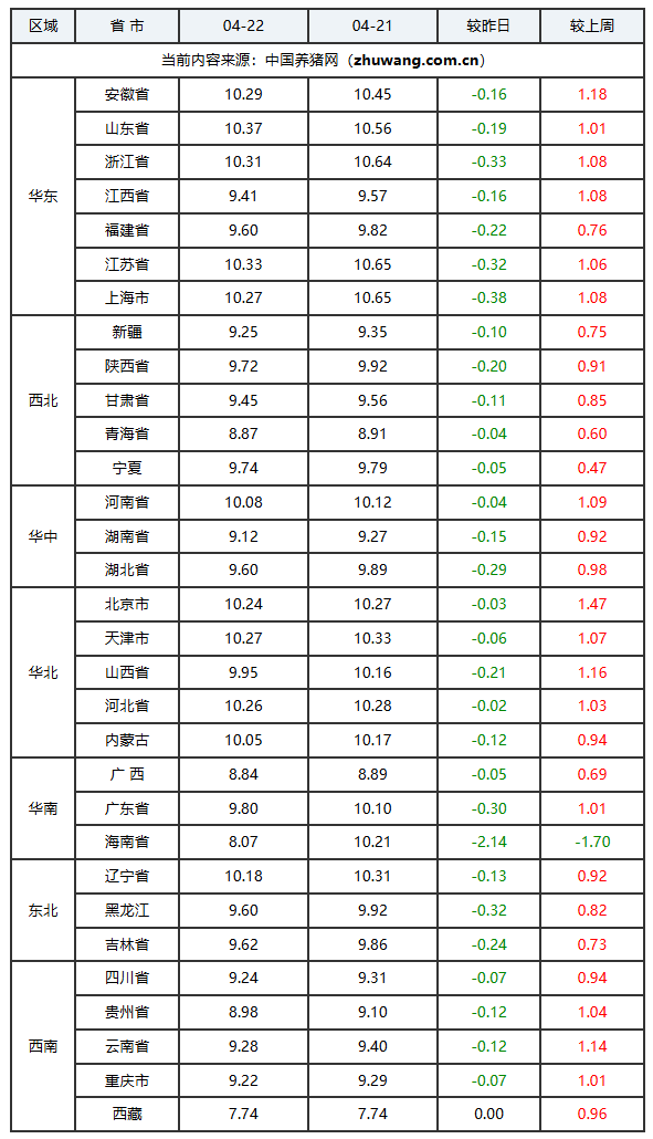 据“2026年04月22日-中国养猪网生猪(外三元)均价涨跌表”发现,全国猪价呈现延续下跌态势。价格表现方面,全国外三元生猪均价约9.70元/公斤,较昨日下跌0.13元/公斤。近期猪价上涨的“昙花一现”,主要源于供需格局逆转。供应端,集团猪企此前缩量挺价,但本月出栏计划环比增加,中下旬供应压力凸显,养殖端认卖积极性转强,生猪流通逐步改善,市场呈现增量表现。需求端,随着猪价重心上移,二育补栏成本大幅攀升,加之市场对后期行情普遍不看好,二育入场意愿明显减弱;同时屠宰场抄底成本上升,冷冻猪肉库存高企,进一步补库动力不足,样本屠宰企业开工率下降,需求承接力度显著减弱。因此,在供应增加而需求转差的共同作用下,猪价承压回落。
