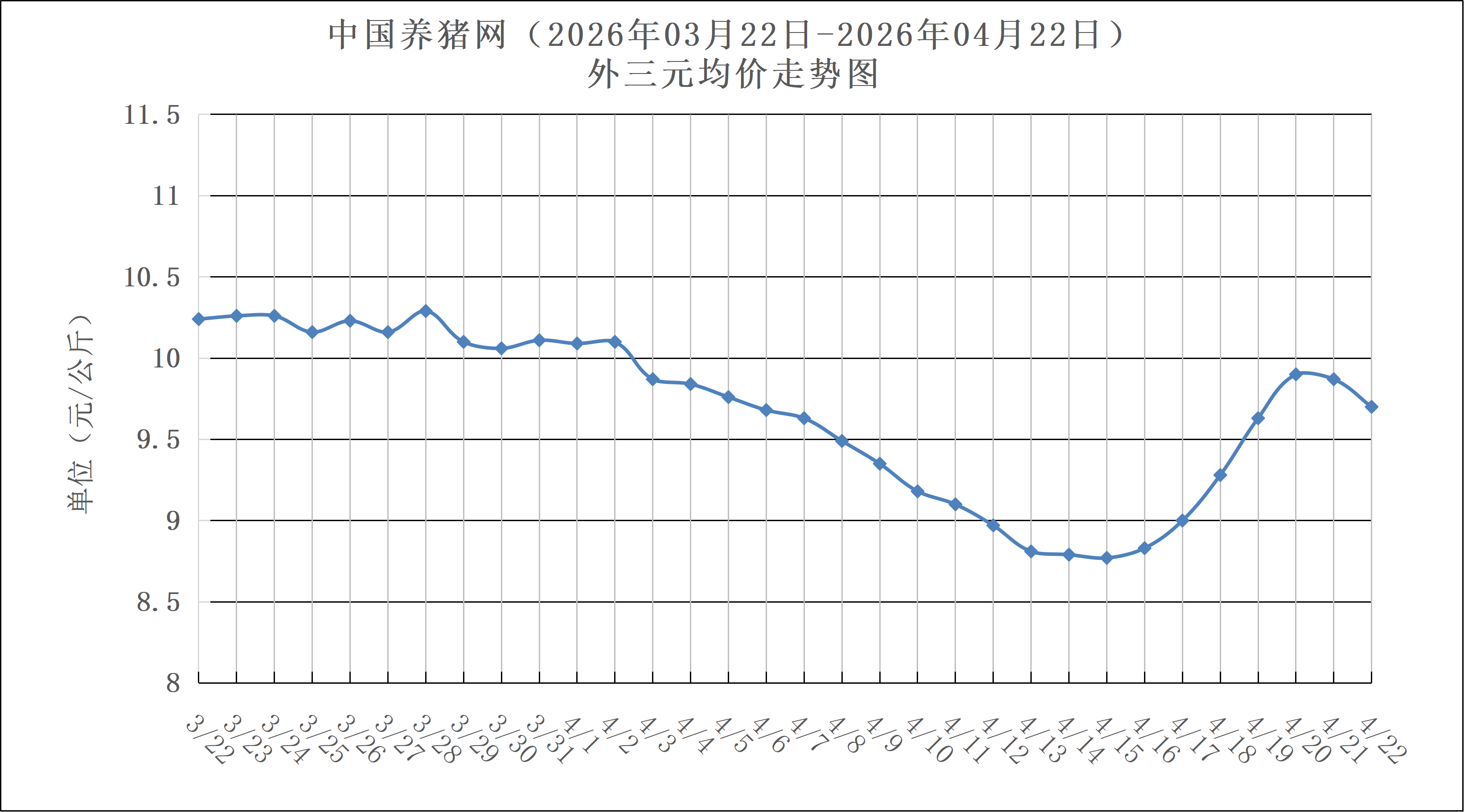 2025年04月22日(星期三),中国养猪网猪价系统数据监测如下:生猪(品种:外三元)均价为9.70元/公斤(4.85元/斤),价格较昨天下跌了0.17元/公斤(0.085元/斤);猪价环比下跌5.27%,同比下跌35.29%。